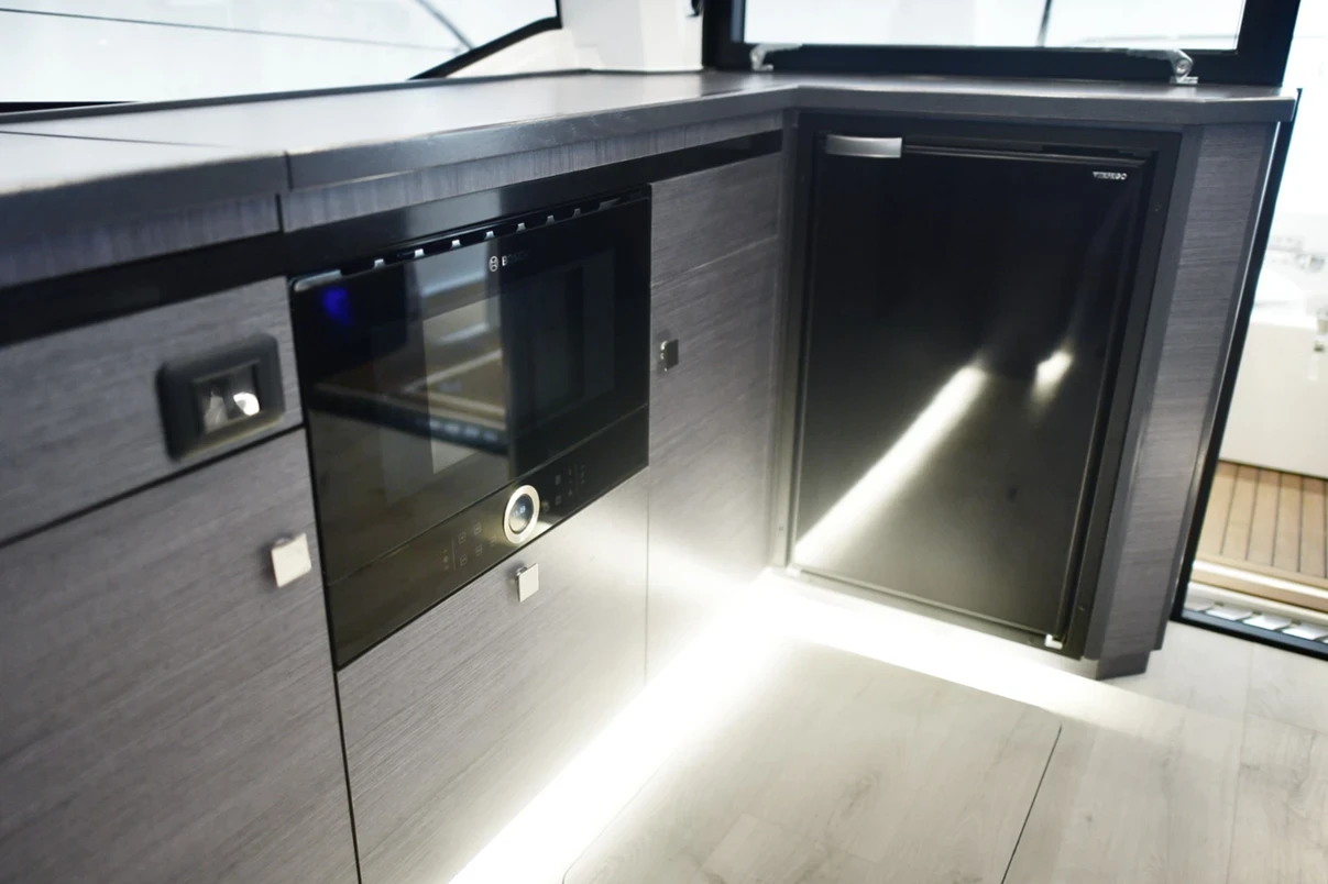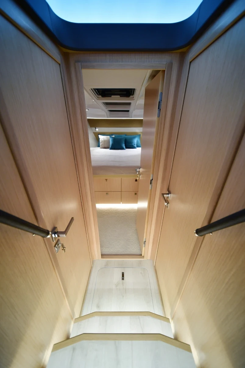 Il Monaco dispone di due cabine spaziose, ideali per accogliere amici e famiglia, con ambienti luminosi e un design ergonomico che garantisce un confortevole letto matrimoniale e un’elevata qualità del riposo. Le finiture in legno, eleganti e funzionali, creano un’atmosfera accogliente e valorizzano la sensazione di spazio, in particolare nella cabina armatoriale. Il comfort di bordo è completato da un ampio bagno, luminoso e ben organizzato, progettato per crociere prolungate e dotato di tutto il necessario per praticità e relax.