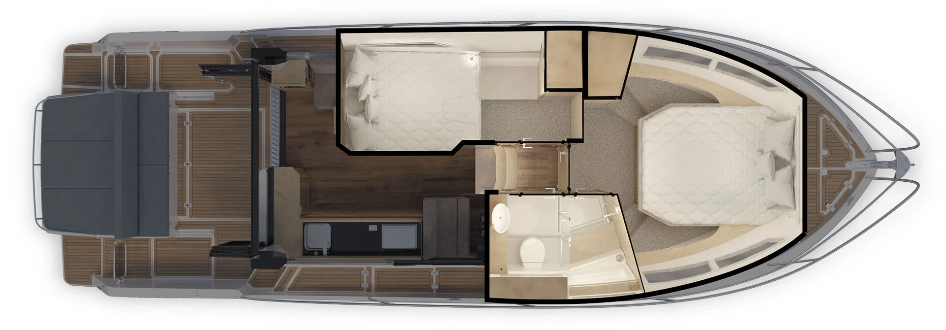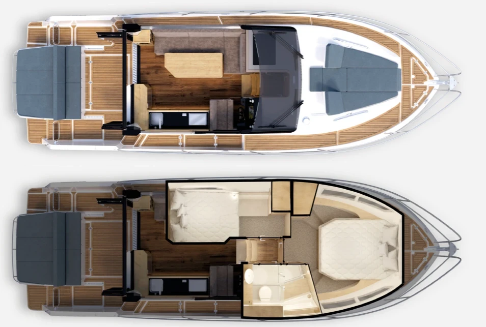 La nostra soluzione innovativa colloca i due fuoribordo Mercury dietro un cofano motori in vetroresina (GRP), combinando la praticità dei motori fuoribordo con un’ergonomia superiore. Questo design consente di sfruttare al meglio un’area di coperta più ampia, riducendo in modo significativo il rumore dei motori nel pozzetto. Il risultato è un’esperienza di bordo più raffinata e coinvolgente.
