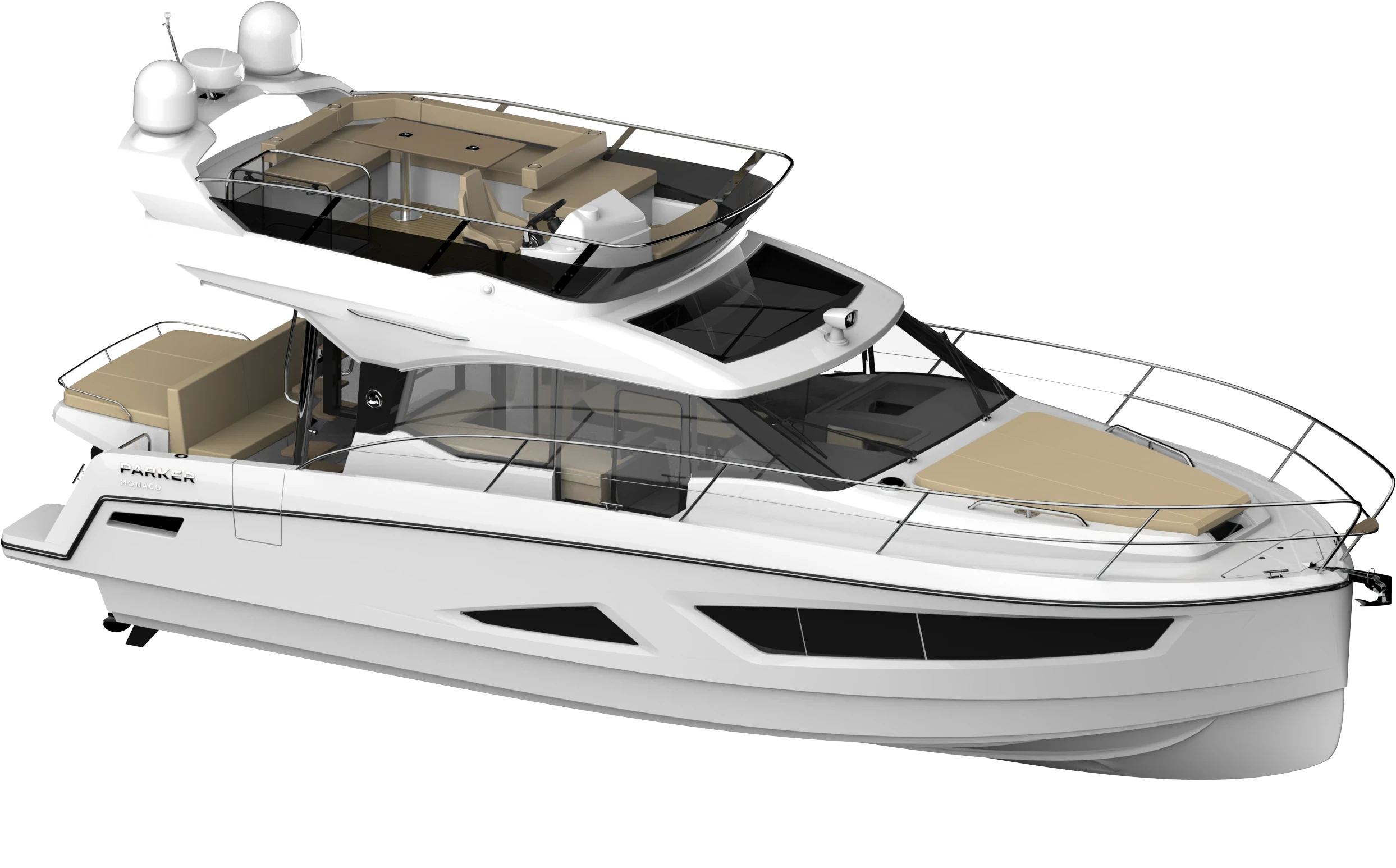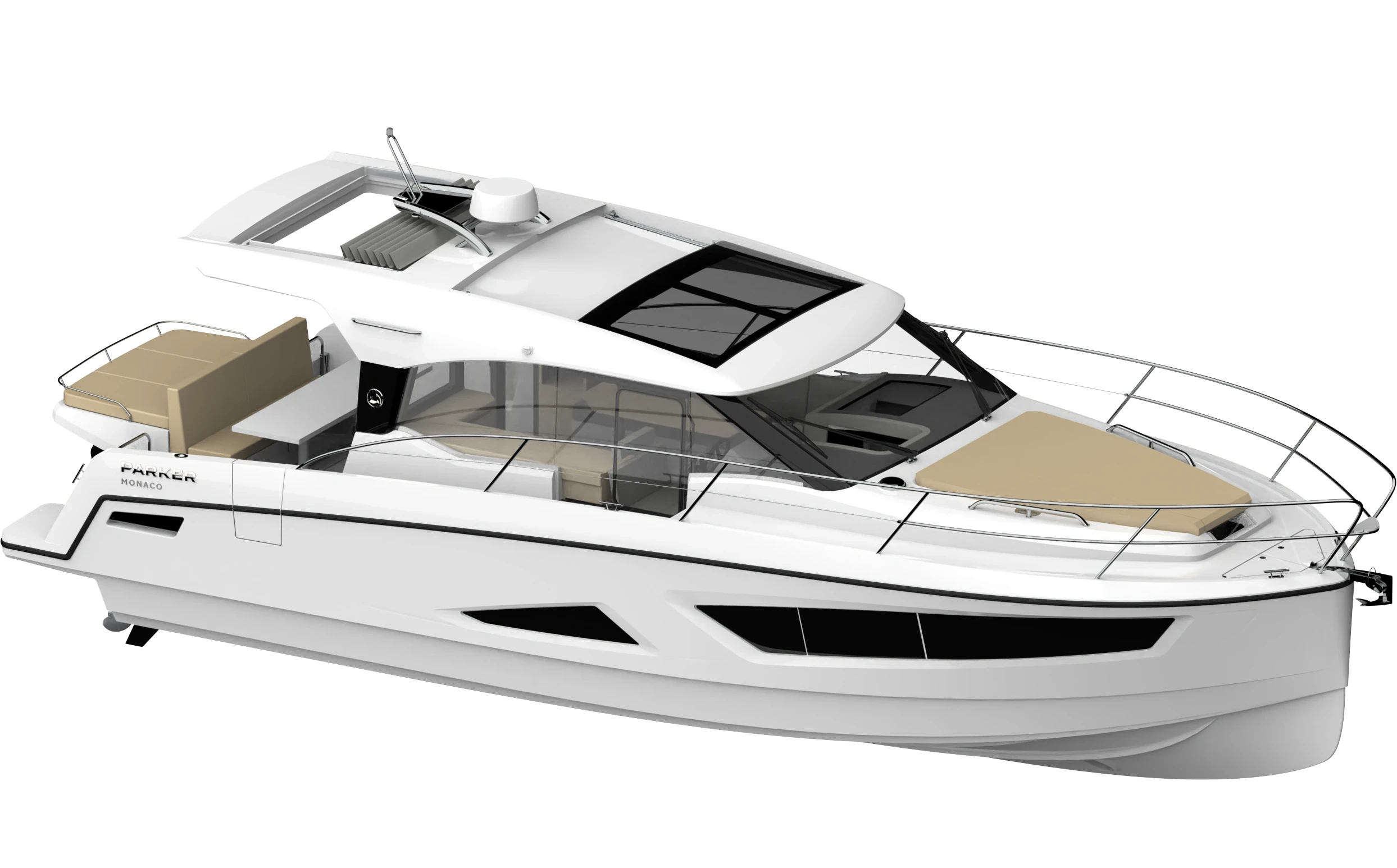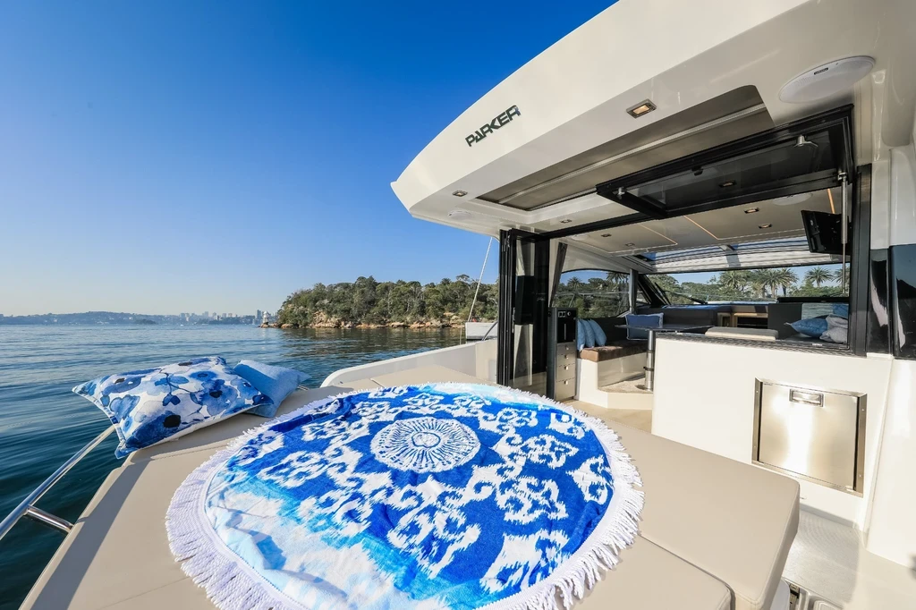 Il Monaco è dotato di una panca di poppa modulare perfettamente integrata nella struttura del cofano motori. Il divano rivolto in avanti può trasformarsi facilmente in un’estensione del prendisole sopra il vano motori. Questa soluzione intelligente crea un’ampia area per prendere il sole all’ancora. L’attenzione di Parker per l’ergonomia si riflette in ogni dettaglio, massimizzando comfort e piacere di vivere la barca.