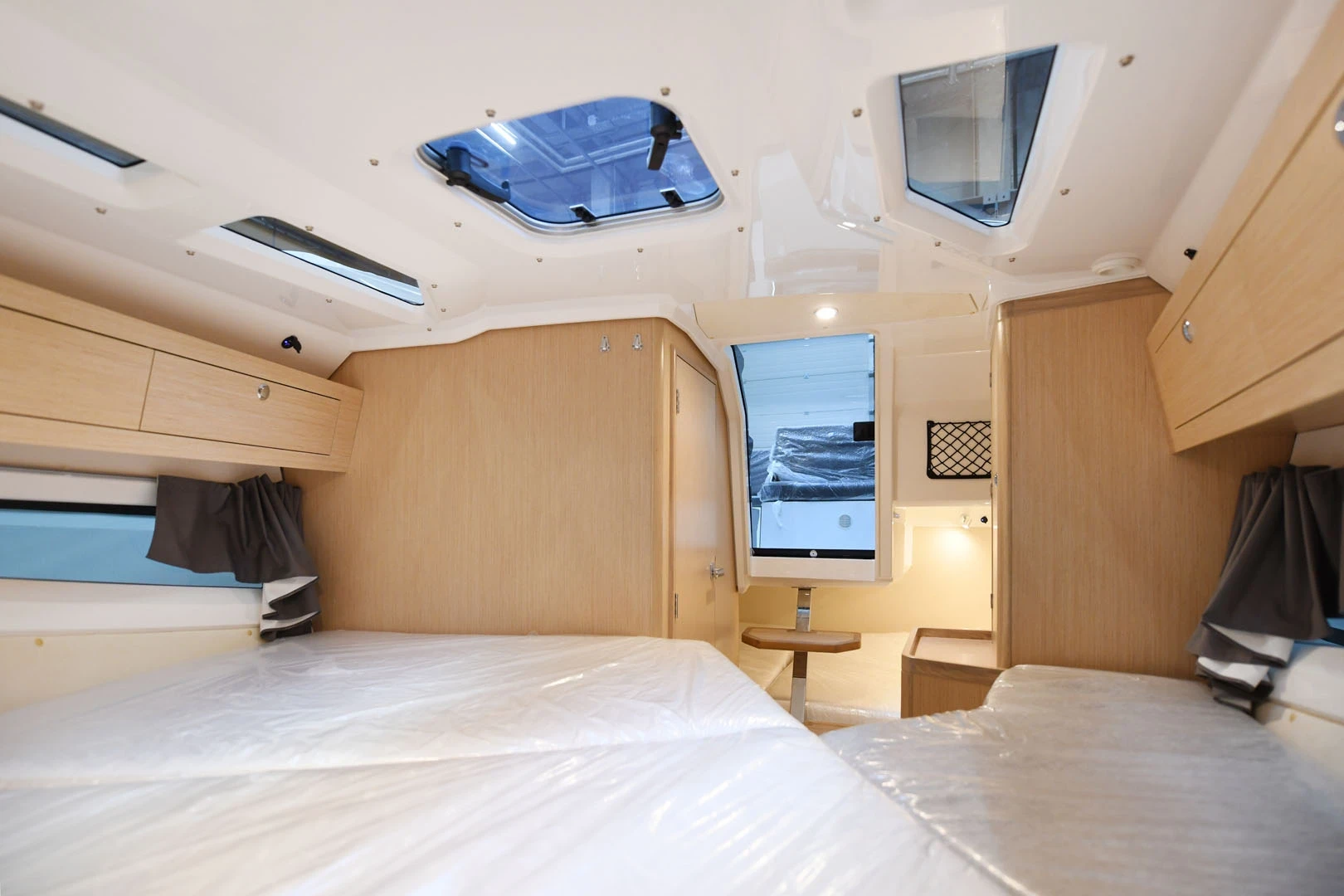 È il day cruiser ideale per uscire in compagnia, fino a dieci persone a bordo, e una scelta eccellente anche per i weekend in mare, con spazio per sei persone, o quattro durante crociere più lunghe. Il pozzetto è ampio e modulabile, pensato per adattarsi a momenti diversi della giornata. A bordo trovi una grande piattaforma bagno con prendisole dedicato, un secondo prendisole nel pozzetto, una cucina completa adatta anche a soggiorni prolungati, posti letto per quattro o sei persone sottocoperta e un bagno separato con wc e doccia. Una barca che unisce comfort, spazio e libertà di vivere il mare senza compromessi.