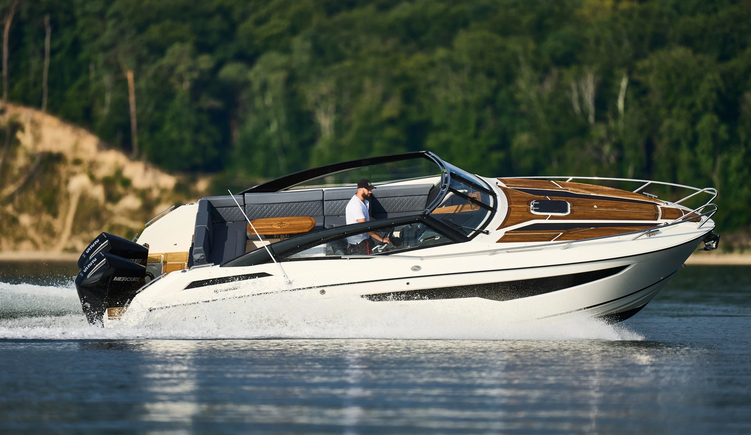 È il day cruiser ideale per accogliere fino a dieci persone e una scelta perfetta anche per i weekend, con spazio per sei persone, o quattro durante crociere più lunghe. Il pozzetto è ampio e flessibile, con diverse configurazioni di seduta. A bordo trovi una grande piattaforma bagno con prendisole dedicato, un secondo prendisole nel pozzetto, una cucina completa adatta anche a soste prolungate, posti letto per quattro o sei persone sottocoperta e un bagno separato con wc e doccia.